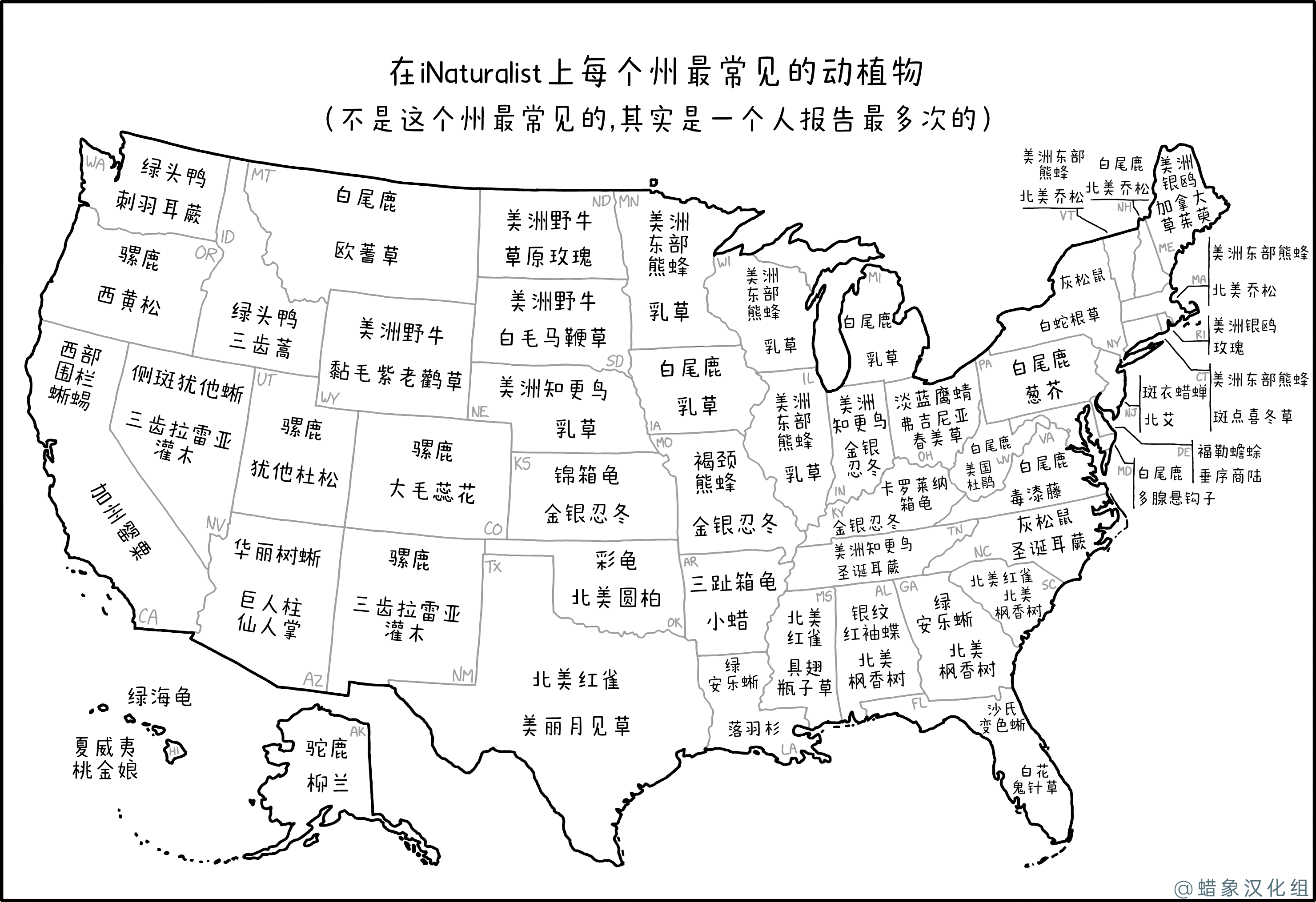 华盛顿DC:灰松鼠,金银忍冬。波多黎各: 冠安乐蜥, 海葡萄。整个美国:绿头鸭,毒漆藤。 注:iNaturalist 是一个在线社区和生物多样性数据平台。