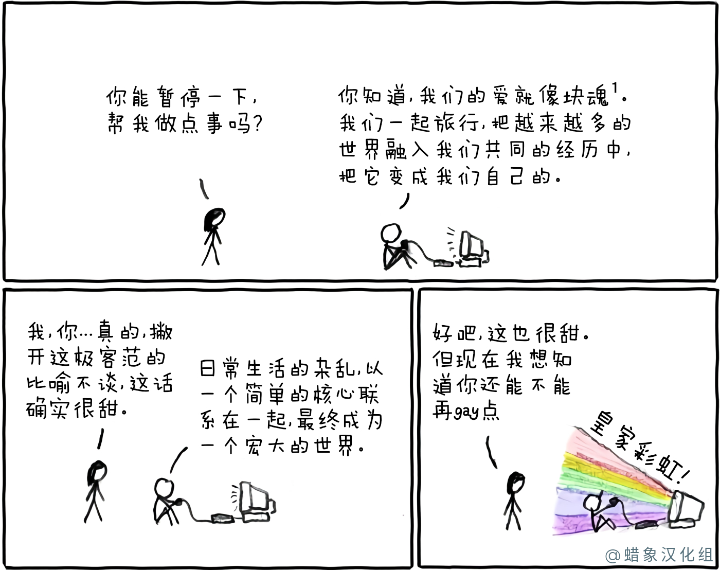 正如宇宙之王所言:“是这件事情很有趣呢?还是它让你忘了自己是谁?” 脚注: [1]块魂:这是一款由Namco开发的经典休闲游戏,游戏里,玩家扮演王子,带着能吸起任何东西的「块」来到地球,终极目标是滚出一个巨大的球球来替代被父亲失手毁掉的月球。